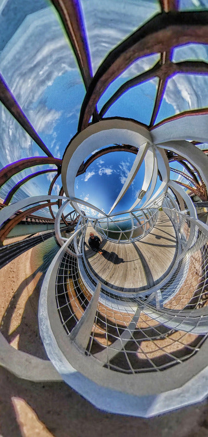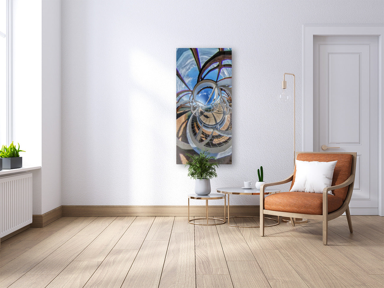 Chaque image de la collection Paysages urbains de Montréal a été créée à l'aide d'une caméra 360° et transformée grâce à des techniques de retouche numérique avancées. Elles ne sont pas générées par l'IA ; elles sont capturées dans le monde réel, puis réimaginées par distorsion, inversion et rééquilibrage de la lumière pour offrir une vue surréaliste, mais fidèle à l'environnement de Montréal.